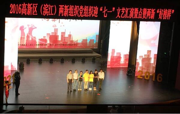 为促进文化交流、增进友谊,充分展示企业员工积极向上的精神风貌,2016高新区(滨江)两新组织党组织“畅想青春,拥抱G20”迎“七一” 文艺汇演暨点赞两新“好榜样”活动于6月26日(周日)14:00在杭州高新区(滨江)文化中心二楼剧院隆重举行,来自高新区(滨江)区委领导、各高新企业员工代表等约300人参加。
