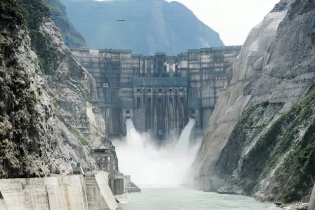 锦屏一级水电站混凝土双曲拱坝高305米,足有大楼100层高,为当今世界最高的拱坝。该大坝的原理类似于拱桥。拱桥是将竖直向下的重力,通过拱形分散到两侧桥墩;而拱坝的原理是将水平方向的水压力,分散到两侧山体中,因此拱坝也称卸力坝。与拱坝相对应的是重力坝,常见的水库、水电站基本采用重力坝,它利用大量的泥土、石头、混凝土强行拦断江面,利用这些材料的重量抵挡水压。相较于重力坝,拱坝能更大限度地利用材料的特性,使用最少的材料达到最大的效果,同时也伴随着更大的施工难度。锦屏一级水电站混凝土拱坝的建成,经历了诸多世界级难题,也形成了世界级工程成果,是我国自主掌握水利水电建设核心技术的例证。