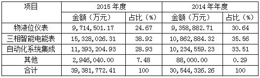 2015年营业收入3938万元,2014年度营业收入3054万元,其中主营业务收入占营业收入的比例分别为98.45%、97.87%,主打产品为物液位仪表、水质分析仪器及自动化系统集成。
