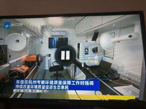 电视屏幕上这辆车就是由聚光科技(杭州)股份有限公司研制的方舱式“移动实验室”。