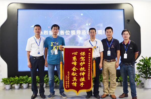 9月21日上午,杭州天然气公司该项目负责人厉强来到中控信息公司,为圆满完成任务的中控信息公司送上锦旗——“保驾护航伸援手,心系峰会献真情”。中控信息公司高级副总裁赵鸿鸣、公用工程事业部常务副总经理金红达等热情接待并接受锦旗。
