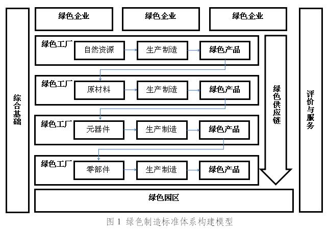 绿色制造标准体系由综合基础、绿色产品、绿色工厂、绿色企业、绿色园区、绿色供应链和绿色评价与服务七部分构成。综合基础是绿色制造实施的基础与保障,产品是绿色制造的成果输出,工厂是绿色制造的实施主体和最小单元,企业是绿色制造的顶层设计主体,供应链是绿色制造各环节的链接,园区是绿色制造的综合体,服务与评价是绿色制造的持续改进手段。绿色制造标准体系构建模型如图1所示。