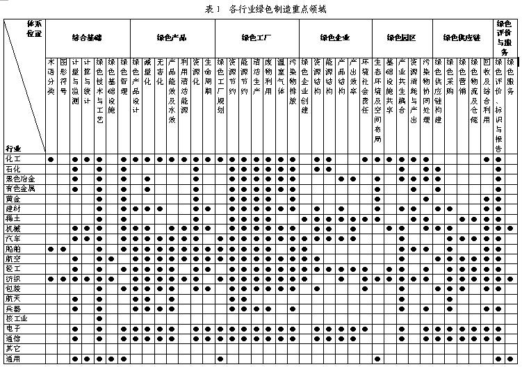 绿色制造标准体系充分体现综合、系统、集成的特点,推动绿色产品、绿色工厂、绿色企业、绿色园区、绿色供应链从设计规划到评价服务等重点领域标准制修订。各行业根据国家和产业发展规划要求和产业特性确定的绿色制造重点领域如表1所示。