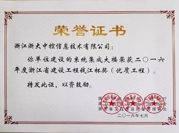 浙江省建筑业行业协会和省工程建设质量管理协会于2015年12月启动开展了2016年度浙江省建设工程钱江杯奖(优质工程)评选活动,省住房和城乡建设厅于2016年7月公布了中控信息公司建设的系统集成大楼项目(即“中控信息大楼”)等134项工程被评为2016年度浙江省建设工程钱江杯奖(优质工程)。10月13日,中控信息公司收到颁发的奖牌和荣誉证书。
