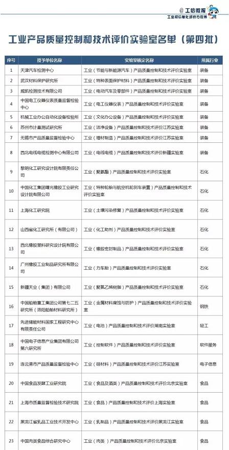 为贯彻落实《中国制造2025》,推进制造强国建设,依据《工业产品质量控制和技术评价实验室管理办法》(工信部科〔2010〕93号)和《工业产品质量控制和技术评价实验室核定细则(暂行)》(工信厅科〔2010〕143号),经工业产品质量控制和技术评价实验室专家技术委员会审议,现将“工业(节能与新能源汽车)产品质量控制和技术评价实验室”等23家第四批工业产品质量控制和技术评价实验室名单(见附件)予以公布。