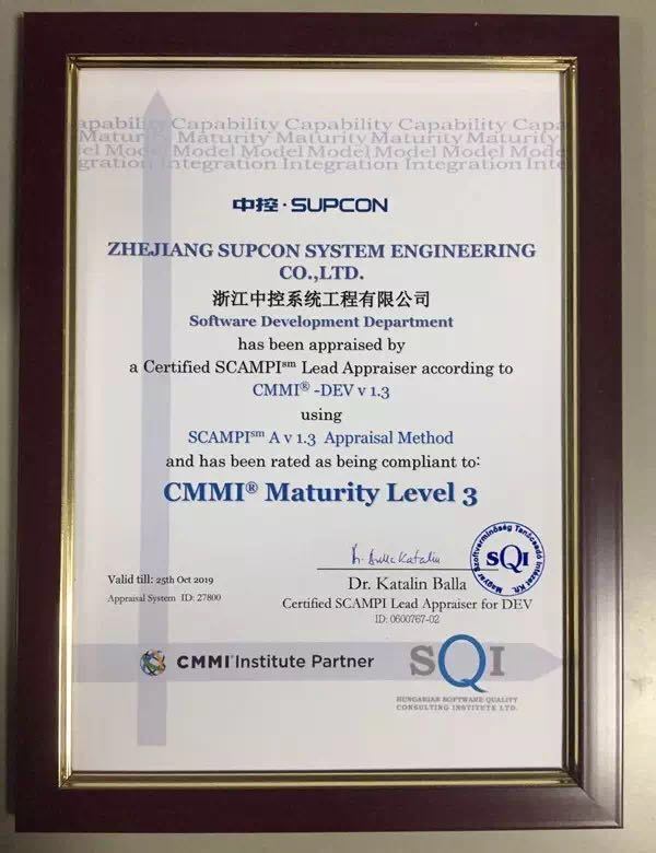 11月21日,中控系统工程公司最终通过美国软件工程学会(Software Engineering Institute)验证,正式取得CMMI3资质证书。该资质的取得对提高公司的开发能力、管理能力和市场竞争能力具有重要意义。