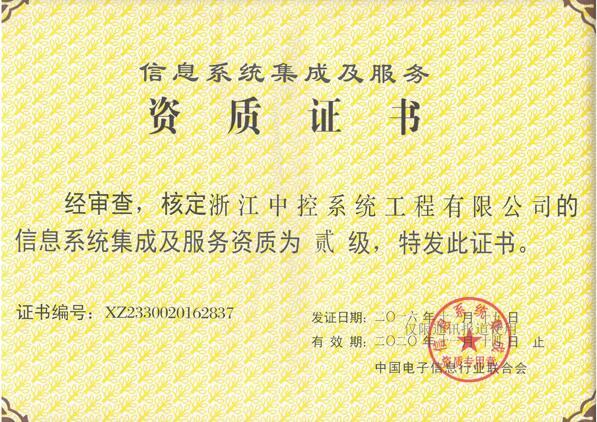11月24日,中控系统工程公司收到由中国电子信息行业联合会颁发的《信息系统集成及服务资质证书》,资质等级为贰级。