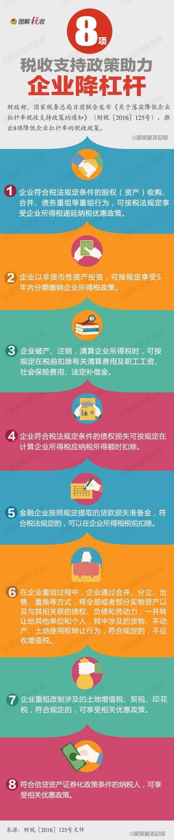 财政部、国家税务总局日前联合发布《关于落实降低企业杠杆率税收支持政策的通知》(财税〔2016〕125号),推出8项降低企业杠杆率的税收政策。一图了解具体内容。
