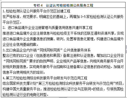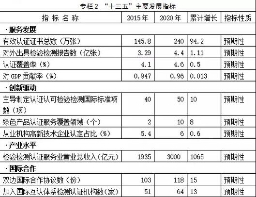 推动公共信用信息体系建设。积极探索认证认可检验检测信息与公共信用信息互联互通,推动第三方评价结果成为公共信用信息的重要组成部分。探索引入有资质的第三方信用服务机构,大力完善认证认可检验检测相关业务数据、监管数据、风险信息的统计和监测工作,推动重点信用数据和信息纳入全国信用信息平台,提升认证认可检验检测信用信息的可靠性、可用性。 har-indent-count:2.0;line-height:17.0pt; mso-line-height-rule:exactly;background:white;word-wrap: break-word'>检验检测认证服务业实现较快增长。质量品牌提升活动取得重大成果,从业机构核心竞争力显著增强,品牌效应更加突出,行业营业总收入显著增长,检验检测认证机构整合工作加快推进,检验检测认证服务业成为最具增长潜力和市场活力的生产性服务业/高技术服务业门类之一和特色鲜明的技术性基础产业。国际化水平迈上新的台阶。双边合作机制化水平有新的提高,多边合作取得新的突破,我国在国际认证认可领域的话语权显著增强。国际互认取得显著成效,认证认可检验检测“走出去”初步形成规模,服务“一带一路”建设卓有成效。