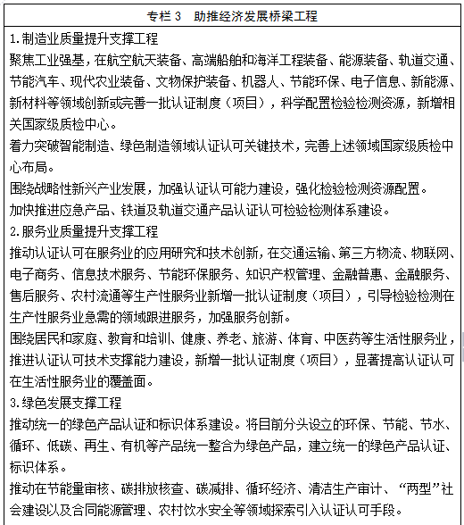 支持宏观政策实施。在产品、食品、信息安全,绿色发展、创新发展等方面,加强检验检测认证手段创新,配合相关国家重大政策实施,提供评价手段,提升实施效果。推动认证认可在去产能、降成本、补短板过程中发挥更大作用,为战略性新兴产业发展提供评价手段和技术支撑。推动绿色产品标识和认证在相关政府优先采购政策中发挥实施保障作用。
