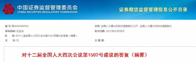 2月8日中国证券监督管理委员会发布了《对十二届全国人大四次会议第1502号建议的答复(摘要)》,证监会在对十二届全国人大四次会议第1502号建议的答复中提到,证监会一直高度重视中小企业融资难的问题,采取多种措施拓宽融资渠道,降低融资成本。节能环保科技型中小企业可以充分利用资本市场发展壮大。另外,证监会将多措并举,进一步促进私募基金更好支持初创型、科技型中小微企业发展;将继续积极支持包括节能环保企业在内的绿色发行人利用公司债券市场融资发展。下一步将继续支持符合国家产业政策和发行上市条件的节能环保企业上市融资,鼓励节能环保企业利用资本市场做大做强。