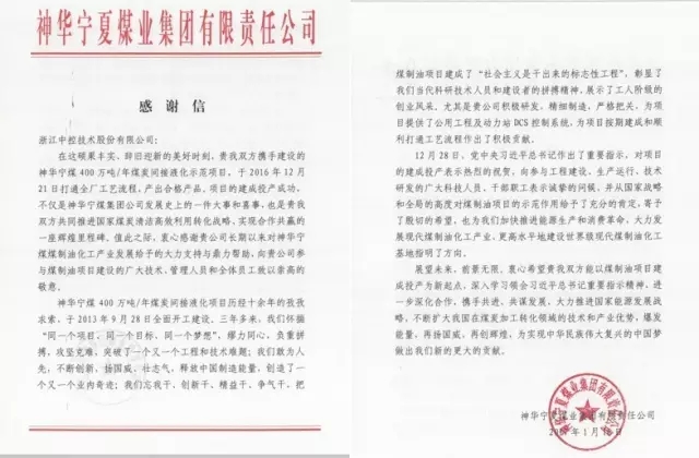 日前,一封来自神华宁煤的感谢信发到了中控,信中有一个振奋人心的消息:2016年12月21日,由中控携手神华宁煤共同建设的神华宁煤400万吨/年煤炭间接液化示范项目打通全厂工艺流程,产出合格产品!