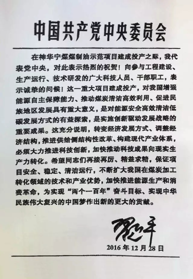 12月28日,习主席对神华宁煤煤制油示范项目建成投产作出重要指示,代表党中央对项目建成投产表示热烈的祝贺,向参与工程建设、生产运行、技术研发的广大科技人员、干部职工表示诚挚的问候。