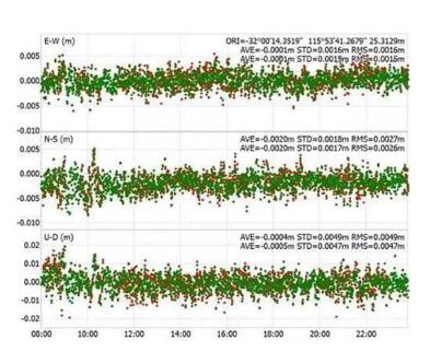 三星系统(红色)和四星(绿色)系统RTK解算偏差时序对比图