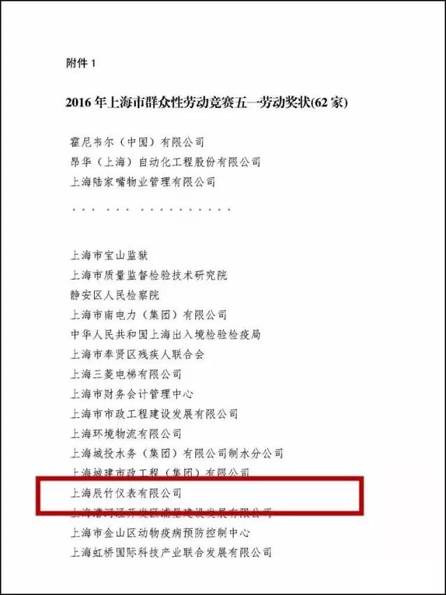 日前,上海辰竹仪表有限公司(以下简称为“辰竹”)被上海市总工会授予2016年上海市“五一劳动奖状”光荣称号。本次上海市共有62家企业获此殊荣 。