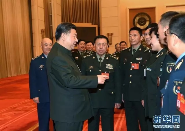3月12日,中共中央总书记、国家主席、中央军委主席习近平出席十二届全国人大五次会议解放军代表团全体会议并发表重要讲话。这是会议结束时,习近平亲切接见来自基层部队的部分军队人大代表。新华社记者 李刚 摄