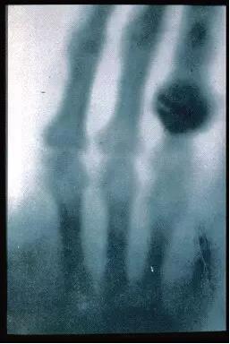 1895 年 12 月 28 日他发表了关于新射线的论文。 他称这种本质尚不清楚的新射线为 X 射线。1896 年 1 月 5 日,维也纳《新闻报》报道了伦琴发现 X 射线的 消息,并引起了轰动。1 月 23 日,伦琴在维尔茨堡大学物理研究所作了关于 X 射线的第一次报告。他还邀 请维尔茨堡大学解剖学教授克利克尔,用 X 射线拍摄 了克利克尔一只手的照片。克利克尔教授带头祝贺, 当即建议把这种射线命名为伦琴射线。