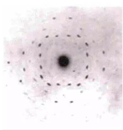 大约在 1912 年 1 月底,德国物理学家索末菲 (A. Sommerfeld,1868~1951) 的一位学生厄瓦尔德 (P. Ewald) 在准备博士论文过程中,为研究光波在晶格中 的行为而寻找数学处理方法时遇到了一些困难,为此 他向劳厄 (M. Laue)( 见图 6) 请教。在他们的探讨中劳 厄了解到晶体中原子间的距离很小,与可见光的波长 相比大概只有波长的 1/500 或 1/1000。劳厄想到,虽然人工做不出这样细的光栅,但自然界中的晶体也许能行。晶体是一种几何形状整齐的固体,而在固体平 面之间有特定的角度,并且有特定的对称性。这种规律是构成晶体结构的原子有次序地排列的结果。一层原子和另一层原子之间的距离大约是 X 射线波长的大小。如果这样,晶体应能使 X 射线衍射。劳厄酝酿出一个实验:把晶体当作一个三维光栅,让一束 X 射 线穿过,由于空间光栅的间距与 X 射线波长的估计值在数量级上近似,可期望观察到衍射谱。虽然劳厄的想法受到索末菲和维恩 (W. Wien) 等著名物理学家的怀疑,但是在索末菲的助手弗里德里希 (W. Friedrich) 和伦琴的博士研究生克尼平 (P. Knipping) 的支持和参与下,他们终于成功地观察到 X 射线透过硫酸铜后的衍射斑点。通过改进仪器设备数周后他们照出更为清晰的 ZnS、PbS 和 NaCl 等晶体的 X 射线衍射图 ( 如 图 7 所示 )。