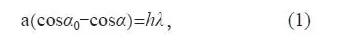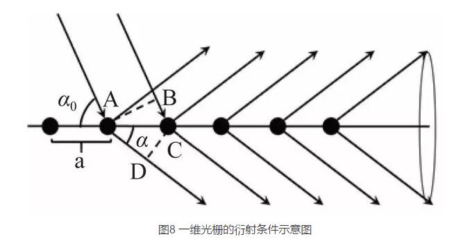 这里先讨论一维光栅,如图 8 所示,当光入射到光栅常数为 a 的一维光栅时,光将发生衍射。形成衍射极大 ( 即亮条纹 ) 的条件是光程差为波长的整数 倍。由图 8 可知相邻衍射光线的光程差为距离为 BCAD,由此可得一维光栅衍射的理论公式: