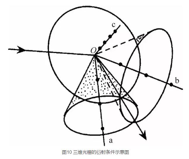 如图10 所示,此时形成亮斑的条件是三个满足公式(3) 的那些三个方向上圆锥面的交线。(3) 式即为描述晶体X 射线衍射的劳厄方程。式中 a,b,c 分别为三