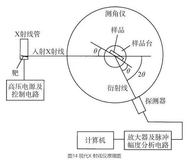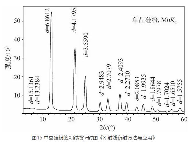 现代的 X 射线衍射仪的原理如图 14 所示,从 X 射线管射出的 X 射线经准直后照射在样品上;在测量 过程中样品在计算机的控制下匀速转动,其入射角以 一定的角速度变化,测量衍射光强的探测器则以 2 倍于入射角的角速度变化;由此来记录衍射光强随入射角的变化,从而测出各个晶面间的面间距。图 15 给 出了比较典型的粉末晶体 Si 的 X 衍射图,每一个衍射峰对应一簇晶面的面间距,通过计算机与已知晶体的衍射资料库进行比对即可确定样品是什么晶体,或者发现新的晶体。