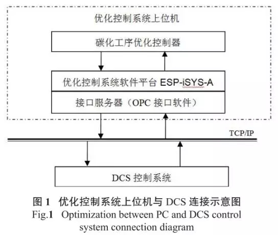 碳化工序优化控制器运行在优化控制系统上位机中,OPC Server 通讯接口软件作为连接先进控制上位机与 DCS数据交互的桥梁。先进控制上位机通过 OPC 接口服务器,与安装有 OPC Server 的 DCS 操作站联接,由于该操作站与DCS 控制站通过内部协议建立了数据传送的物理链接,这样先进控制系统也就与 DCS 控制站实现了数据传送的物理链接。先进控制系统与 DCS 控制站两者的数据交换是通过OPC 标准接口来实现的。软件结构如图 1 所示。