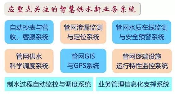 上图是水务运营的一些管理内容,图的上部分是供水管理内容,下部分是其它水务管理内容。姚灵提出,应对重点关注的智慧供水新业务系统进行梳理,这些都是以测控系统为主的过程管理,也包括了水务内部的业务信息化支撑系统。