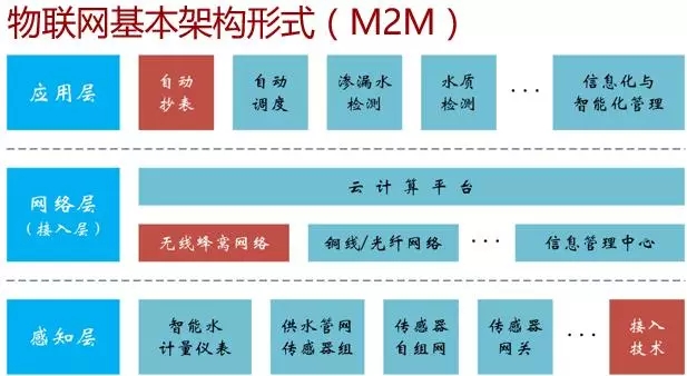 大家都知道,互联网的基本架构,是人与人的信息交互。而物联网,是M2M,就是机器与机器之间的交互。目前简单的划分,可以将其分成三个层次,最下面的是感知层,即仪表和传感器,网络层是解决数据安全传输的问题,应用层将采集到的数据进行业务处理等。