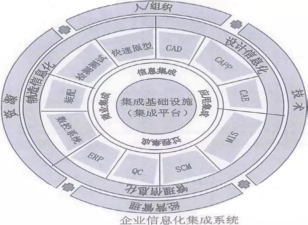 信息化集成系统分为两大部分:控制系统(或称控制制造系统)与企业系统(或称企业信息化系统)。信息化集成系统则是这两大部分的综合与集成。