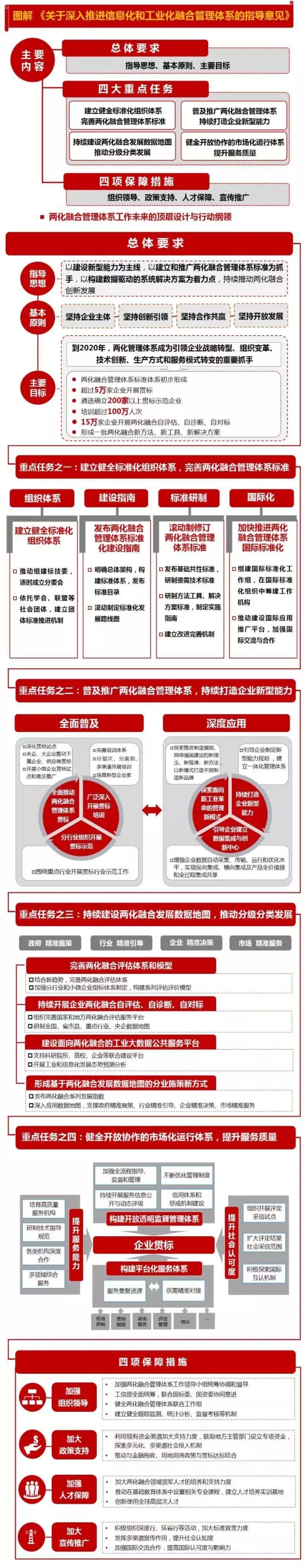 持续推进信息化和工业化融合(以下简称两化融合)是党中央、国务院的战略部署,两化融合管理体系是推进两化深度融合的重要举措和有力抓手。日前,工业和信息化部、国务院国有资产监督管理委员、国家标准化管理委员会联合印发了《关于深入推进信息化和工业化融合管理体系的指导意见》(工信部联信软〔2017〕155号,以下简称《指导意见》),明确了系统推进两化融合管理体系的指导思想、工作目标、重点任务和保障措施,其核心是深化实施和普及推广两化融合管理体系标准,加速技术创新和管理变革,提升全要素生产率和产业核心竞争能力,加快新旧动能接续转换,促进制造强国和网络强国建设。