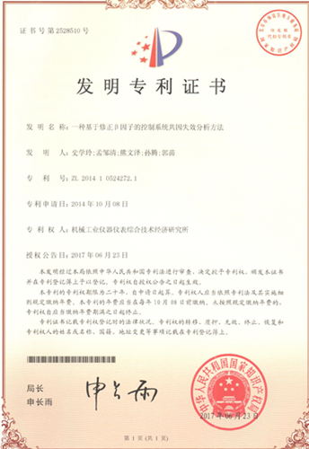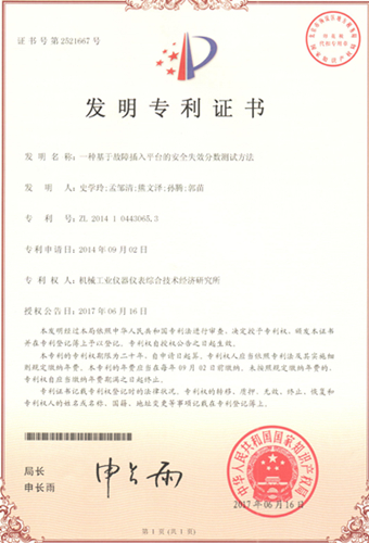 2017年6月仪综所正式取得“一种基于故障插入平台的安全失效分数测试方法”、“一种基于修正β因子的控制系统共因失效分析方法”两项发明专利授权。此两项发明专利是仪综所功能安全中心承担国家863课题时的研究成果,也是攻克功能安全关键技术中取得的突破性成果,为仪综所在安全仪表系统功能安全评估、安全产品功能安全评测的工作提供重要的知识产权保障。