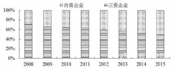 图4内资企业和三资企业高技术产业主营业务收入所占比重(2008-2015年)