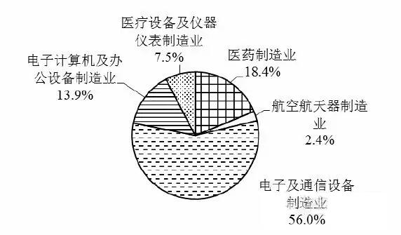 从高技术产业主营业务收入的行业分布看,2015年电子及通信设备制造业主营业务收入所占比重为56.0%,比去年提高近3个百分点;电子计算机及办公设备制造业占比为13.9%,比去年下降了4.5个百分点;医药制造业主营业务收入占比为18.4%,与去年基本持平;医疗设备及仪器仪表制造业主营业务收入占比为7.5 %,比上年下降了0.3个百分点;航空航天器制造业占比与去年持平,为2.4%。