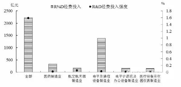 近年来中国高技术产业的R&D经费持续增长。2015年,大中型高技术产业企业R&D经费达到2219.7亿元,占大中型制造业R&D经费的29.7%。高技术产业R&D经费投入强度为1.59%,比去年下降了0.2个百分点。航空航天器制造业的R&D经费投入强度最高,为4.9%,计算机及办公设备制造业最低,为0.82%。