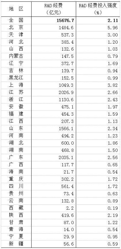 分地区看,研究与试验发展(R&D)经费投入超过千亿元的省(市)有6个,分别为广东(占13%)、江苏(占12.9%)、山东(占10%)、北京(占9.5%)、浙江(占7.2%)和上海(占6.7%)。研究与试验发展(R&D)经费投入强度(与地区生产总值[]之比)超过全国平均水平的省(市)有8个,分别为北京、上海、天津、江苏、广东、浙江、山东和陕西(分地区情况详见附表2)。