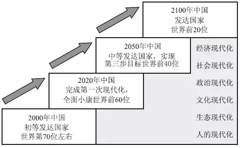 第一个台阶,从2000年到2020年左右,完成第一次现代化,全面建成小康社会,实现工业化、城市化、民主化、市场化和福利化,国家现代化水平进入世界前60名。