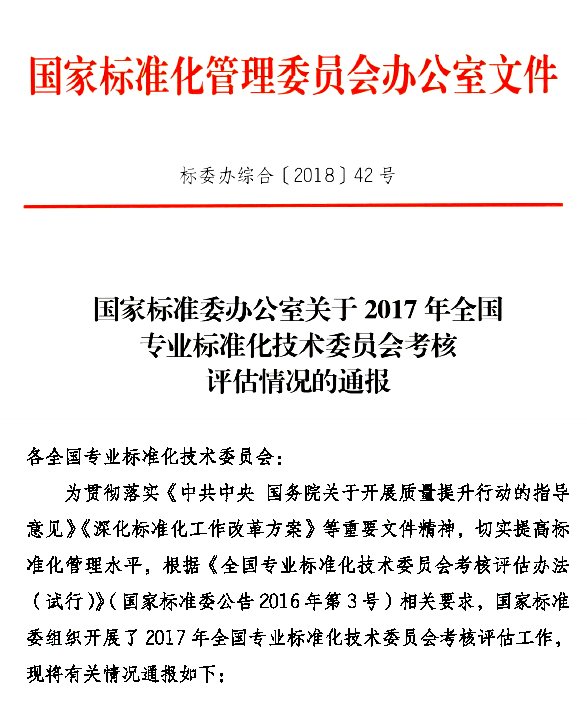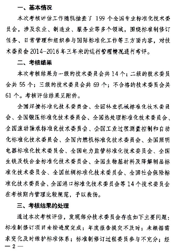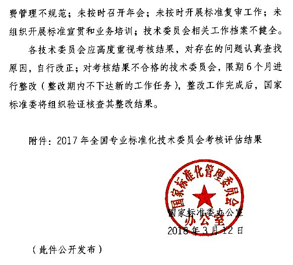 2017年国家标准委对随机抽查的199个全国专业标准化技术委员会进行了考核评估,3月12日国家标准委办公室通报了考核结果。全国工业过程测量控制和自动化标准化技术委员会(TC124)等14个标委会考核结果为一级,受到表扬;二级标委会共55个;三级标委会共69个;不合格标委会61个。对不合格的标委会,限期6个月进行整改,整改期内不再下达新的工作任务,整改工作完成后国家标准委将组织验证核查其整改结果。