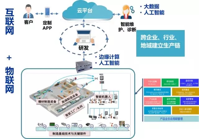 另一方面,借助互联网、云、大数据能等新一代信息技术实现跨企业、跨行业、跨地区的网络协同制造,以及利用人工智能技术实现智能产品的版本升级、远程诊断和预测性维护等智能服务,更进一步将分析结果反馈到规划设计、产品开发、生产优化,实现产品全生命周期的闭环控制。
