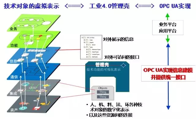 RAMI4.0模型的最大创新在于Z轴即功能级维度,可将其理解为一种信息建模方法,用于对另外两个维度建模——即对生命周期维度进行价值链建模,对层次结构维度进行技术对象建模。RAMI4.0模型在此维度定义了工业4.0组件来作为建模的载体。工业4.0组件由资产和管理壳组成,如图5所示。资产为各种人、机、料、法、环等技术对象,工业4.0组件使用“对象”来数字化(虚拟)表示资产。多个“小”资产可通过数字连接组合成“大”资产。将管理壳附加到资产上,一方面可作为对外展示信息及提供访问的接口,另一方面可对内进行资源管理。如此,使用工业4.0组件就可对工厂层次结构进行数字化(虚拟)表示,建立企业各种资源库(产品库、设备库、工艺库等),并在全生命周期及生产管理工具中实现资源互联互通和互操作。