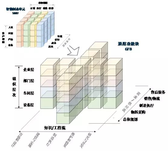 此外,从制造业整体出发,企业实施智能制造具有通用的功能和活动。因此,IVRA还定义了通用功能块(GFB),通过知识/工程流、需求/供应流和企业组织层级三个轴向进行描述,如图8所示。从工程角度出发,知识/工程流包含的设计信息和工程信息,可划分为市场和设计、构造和实现、制造执行、维护和修复、研究和开发五个通用功能。需求/供应流是指由多家企业组成的价值链,涉及将原料转变为最终产品并运送至终端用户的所有活动,包括总体规划、原料采购、制造执行、销售与物流、售后服务。知识/工程流与需求/供应流在制造执行阶段交汇因而具有共同的GFB。更进一步,智能制造通用功能分解到企业的各个垂直层级也形成不同的功能块,自底向上包括设备层、车间层、部门层和企业层。