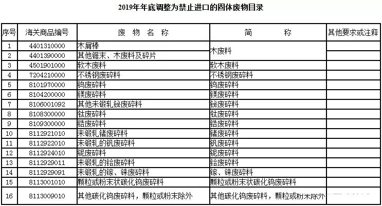 二、将不锈钢废碎料、钛废碎料、木废碎料等16个品种固体废物(见附件2),从《限制进口类可用作原料的固体废物目录》《非限制进口类可用作原料的固体废物目录》调入《禁止进口固体废物目录》,自2019年12月31日起执行。
