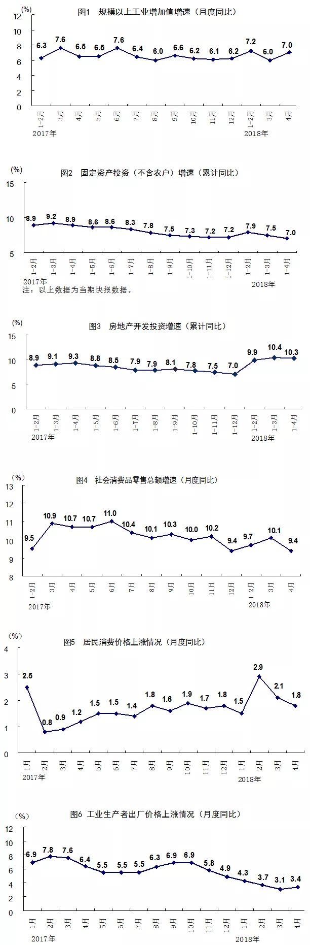 总的来看,4月份国民经济延续了稳中有进、稳中向好的发展态势。但也要看到,外部环境不稳定不确定因素增加,国内发展不平衡不充分问题突出,经济持续健康发展的基础仍需巩固。要以习近平新时代中国特色社会主义思想为指导,深入贯彻党的十九大和中央经济工作会议精神,按照政府工作报告部署,坚持稳中求进工作总基调,以供给侧结构性改革为主线,保持宏观政策的连续性和稳定性,坚持扩大改革开放,深入实施创新驱动,不断增强内生动力,着力振兴实体经济,推动我国经济在实现高质量发展上不断取得新进展。