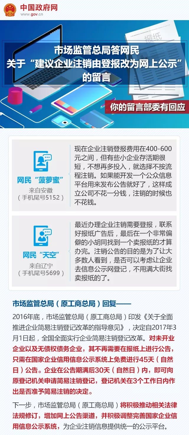 下一步,市场监管总局(原工商总局)将积极推动相关法律法规修订,增加网上公告渠道,并积极调整完善国家企业信用信息公示系统,为企业注销信息提供统一的公示平台,以方便社会公众查询,降低各类市场主体的办事成本,满足群众需要。