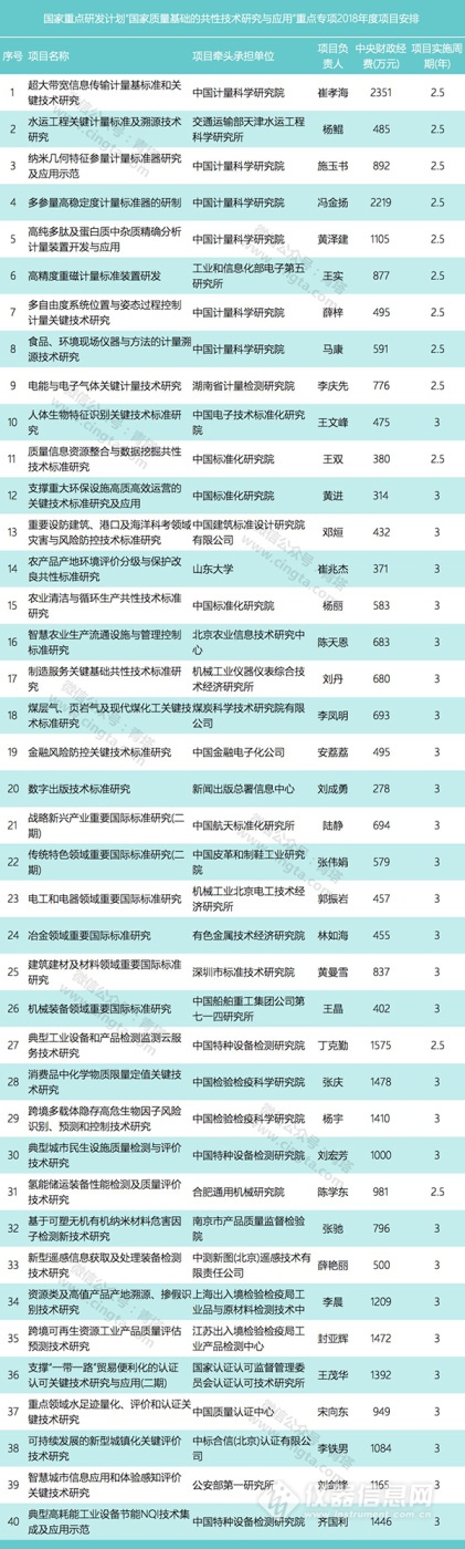 本次公示的是“国家质量基础的共性技术研究与应用”重点专项,拟立项项目总数共40个,总经费达到3.5亿元。