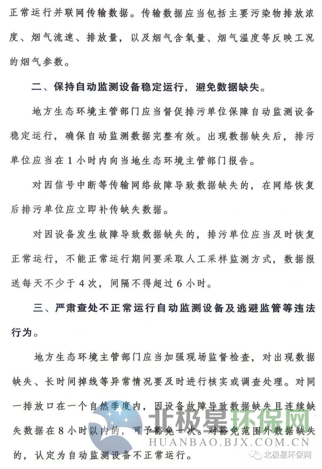 通知明确:对同一排放口在一个季度内,因设备故障导致数据缺失且连续缺失数据在8个小时以内的,可予豁免一次。对豁免范围外数据缺失的,认定为自动监控设备不正常运营。对侵占、损毁、擅自移动、改变自动监控设备等情况,依法责令改正并罚款,据不改正的,责令停产整治。对篡改、伪造监测数据等情况,依法责令改正或停产整治,并处罚款,情况严重的,责令停业、关闭。