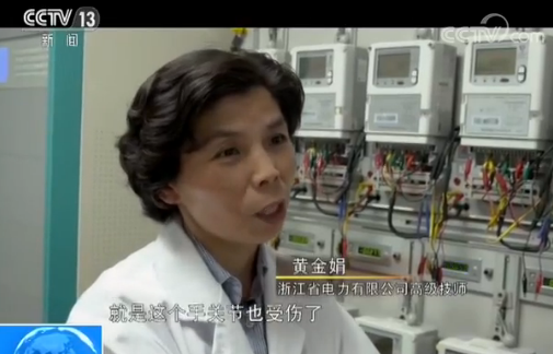 浙江省电力有限公司高级技师 黄金娟:先是挂表接线,检定完成以后我们再要拆线。一个夹子一个夹子拿下来。这个就是大量重复性机械性(的劳动),我们很多的女职工就是这个手关节受伤了我也因此受伤了,现在就是有时候你多洗衣服,拧毛巾,这个手关节马上会感受到。
