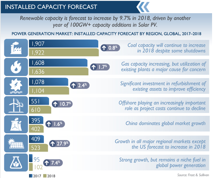 与2017年类似,Frost&Sullivan预计太阳能占投资的大部分,预计2018年为1230.3亿美元,中国将成为主要投资方。太阳能和风能(海上)的需求和投资环境呈现出积极的态势。