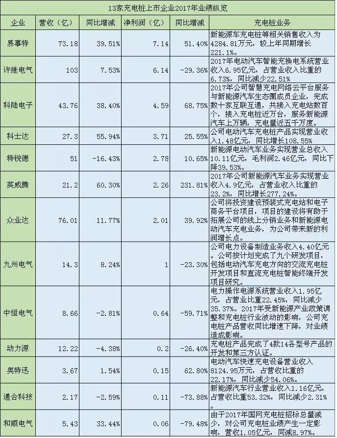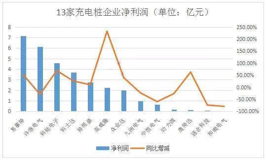 整体看,充电桩概念上市企业2017年报业绩良好。在这13家充电桩企业中,7家企业的净利润均有不同程度的增长,占总数54%。