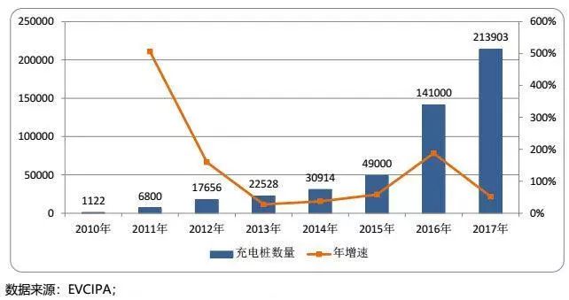 2010-2017年国内电动汽车公共充电桩建设规模及增幅