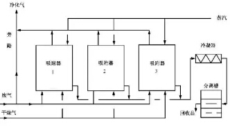 技术原理:采用颗粒活性炭/活性炭纤维作为吸附材料,吸附饱和后的吸附材料利用热源将吸附质气化,解析出的高浓度有机蒸汽被脱附介质带入冷凝单元,经冷凝、分离,回收有机溶剂。依据据脱附介质不同,有水蒸汽脱-溶剂回收附技术和热氮气脱附-溶剂回收技术。